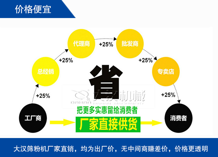 大漢篩粉機廠家直銷,均為出廠價,無中間商賺差價,價格更透明,而且我們公司位于河南省新鄉(xiāng)市,設備的生產(chǎn)成本和運輸成本普遍較低,所以可以節(jié)省大量的資金浪費,篩粉機價格更便宜。
