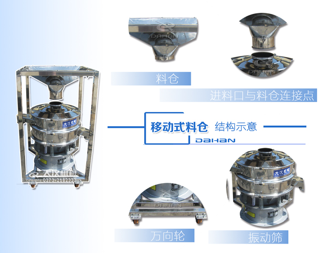 本品大漢公司研制的移動式振動篩料倉一體機,底部加裝可移動式萬向輪,帶進料倉,可將物料一次性裝滿料倉,然后通過調(diào)節(jié)料倉上的蝶閥控制物流進入振動篩的流量進行篩分,本品的特點間歇性加料,不用工人不間斷投料節(jié)省人工,蝶閥控制流量大小能提高篩分精度,同時可將振動篩移動作業(yè),滿足不同地點的工作需要。